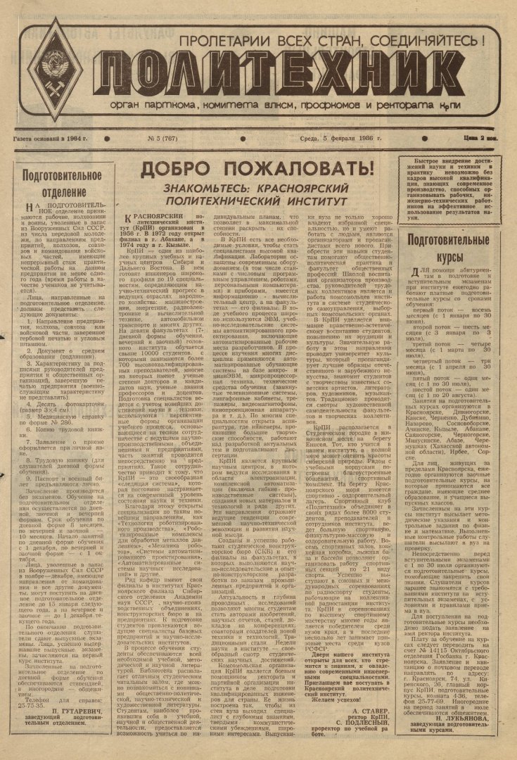 Политехник : газета/ Краснояр. политех. ин-т. - Красноярск : КГТУ, 1964 - - 2006 1986г. N 5 (767) (5 февраля) http://lib3.sfu-kras.ru/ft/LIB2/ELIB_DC/SFUPRSV/sfupol/1986/1986_02_05_0767.pdf