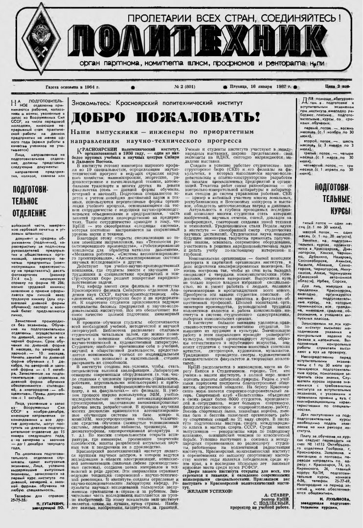Политехник : газета/ Краснояр. политех. ин-т. - Красноярск : КГТУ, 1964 - - 2006 1987г. N 2 (801) (16 января) http://lib3.sfu-kras.ru/ft/LIB2/ELIB_DC/SFUPRSV/sfupol/1987/1987_01_16_0801.pdf