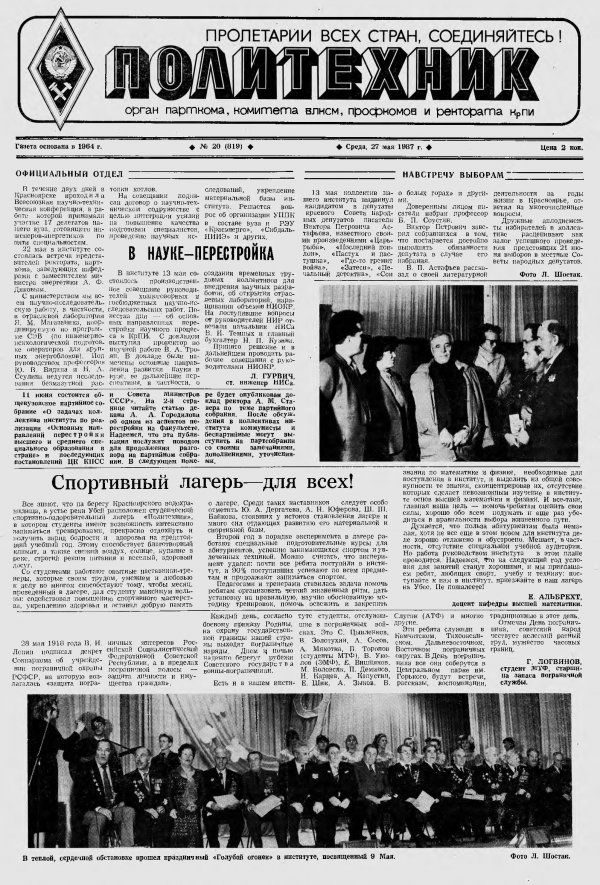 Политехник : газета/ Краснояр. политех. ин-т. - Красноярск : КГТУ, 1964 - - 2006 1987г. N 20 (819) (27 мая) http://lib3.sfu-kras.ru/ft/LIB2/ELIB_DC/SFUPRSV/sfupol/1987/1987_05_27_0819.pdf
