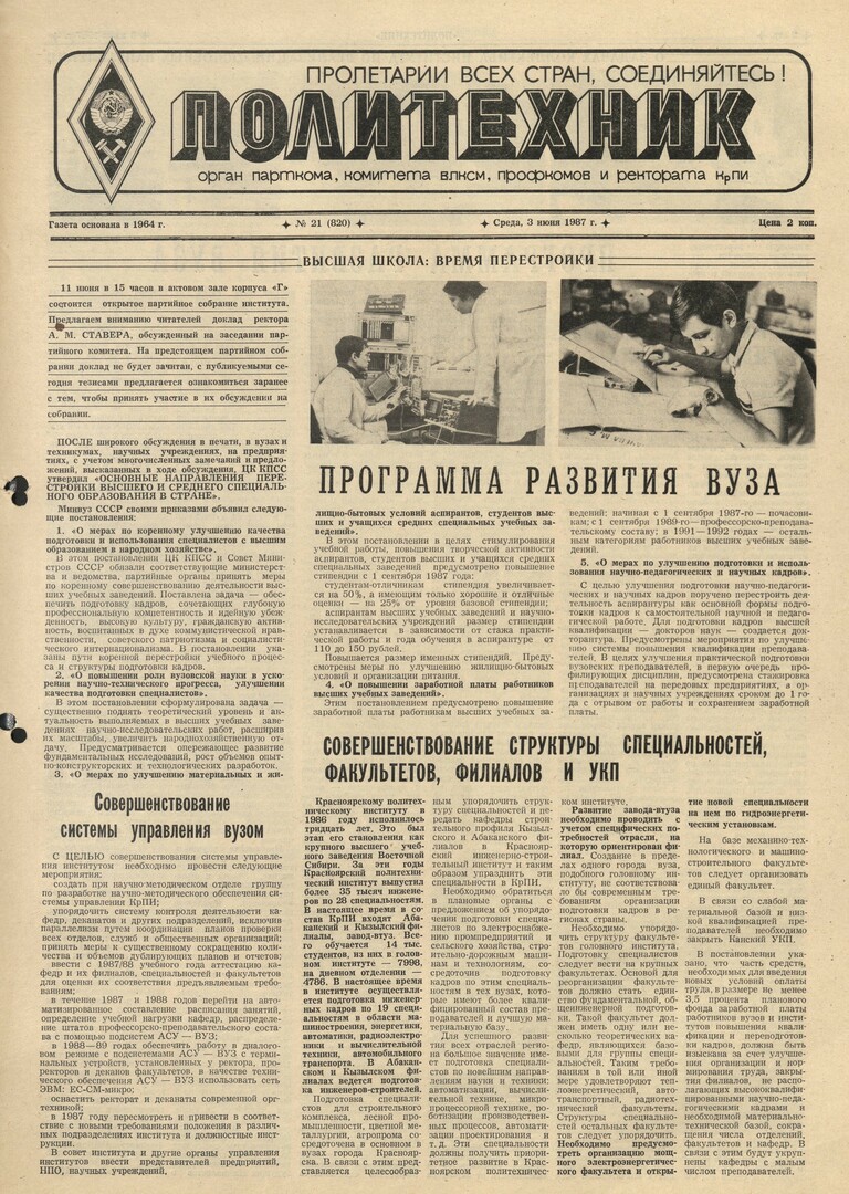 Политехник : газета/ Краснояр. политех. ин-т. - Красноярск : КГТУ, 1964 - - 2006 1987г. N 21 (820) (3 июня) http://lib3.sfu-kras.ru/ft/LIB2/ELIB_DC/SFUPRSV/sfupol/1987/1987_06_03_0820.pdf