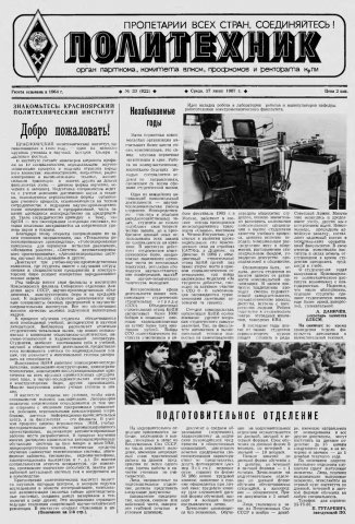 Политехник : газета/ Краснояр. политех. ин-т. - Красноярск : КГТУ, 1964 - - 2006 1987г. N 23 (822) (17 июня) http://lib3.sfu-kras.ru/ft/LIB2/ELIB_DC/SFUPRSV/sfupol/1987/1987_06_17_0822.pdf