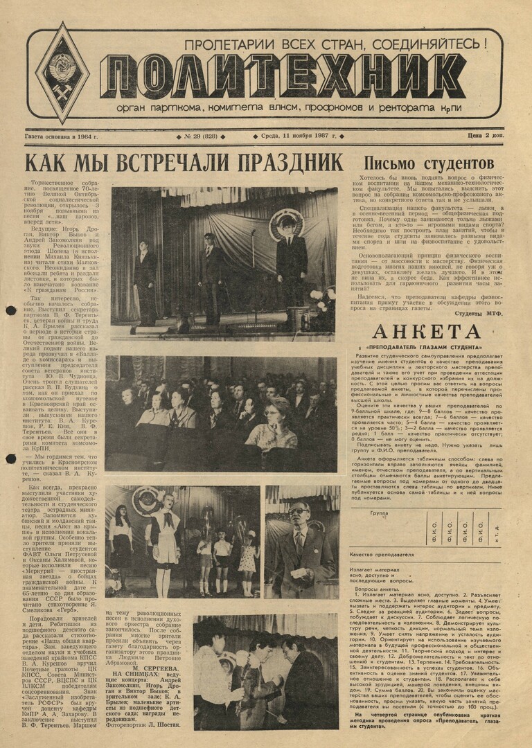Политехник : газета/ Краснояр. политех. ин-т. - Красноярск : КГТУ, 1964 - - 2006 1987г. N 29 (828) (11 ноября) http://lib3.sfu-kras.ru/ft/LIB2/ELIB_DC/SFUPRSV/sfupol/1987/1987_11_11_0828.pdf