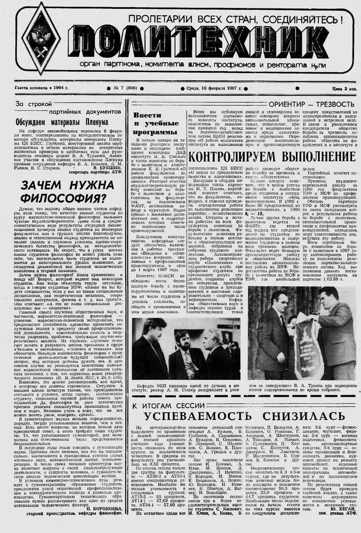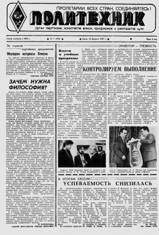 Политехник : газета. 1987 г. № 7 (806) (18 февраля)