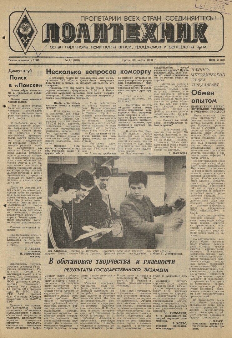 Политехник : газета. 1988 г. № 11 (843) (30 марта)