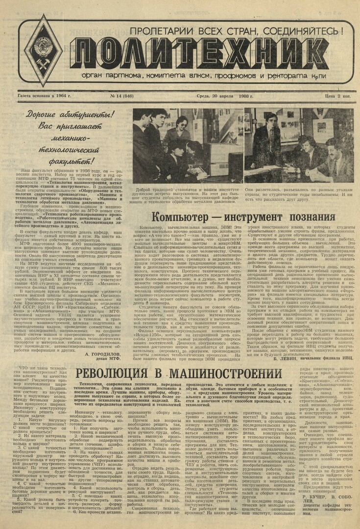 Политехник : газета. 1988 г. № 14 (846) (20 апреля)