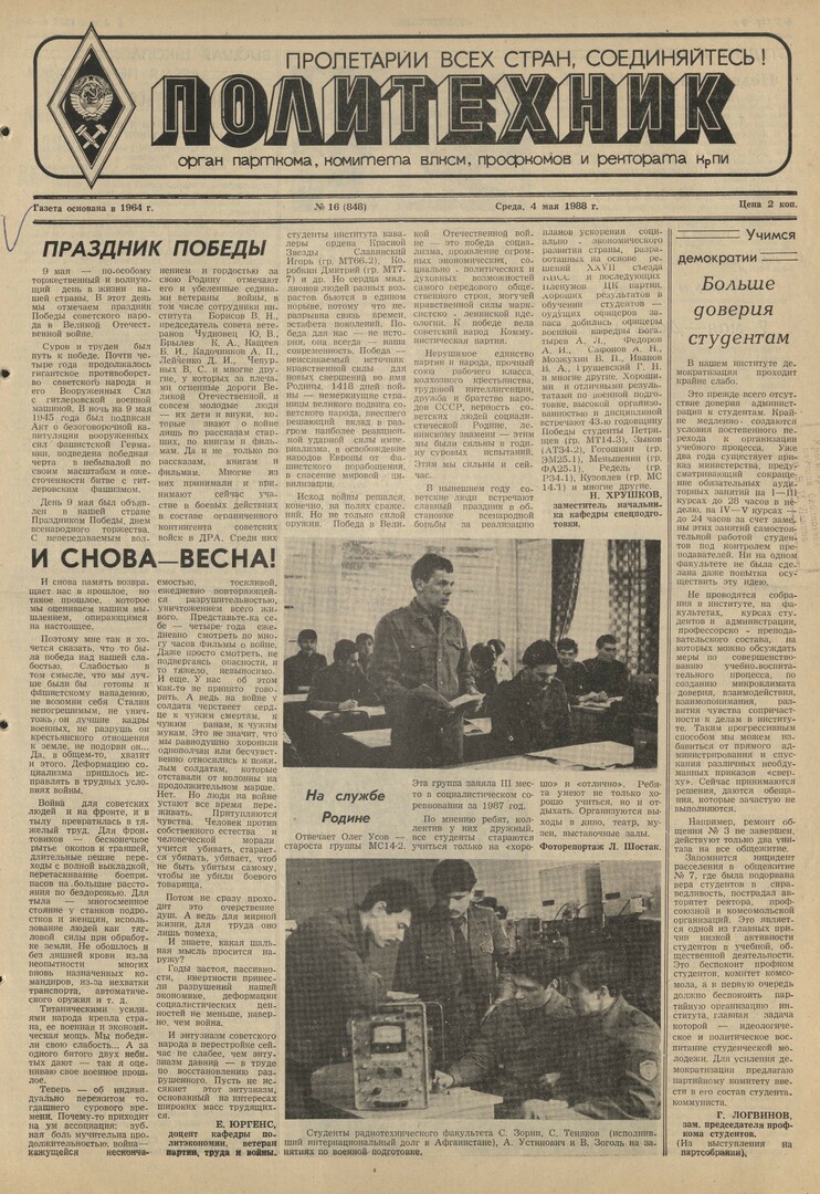 Политехник : газета. 1988 г. № 16 (848) (4 мая)