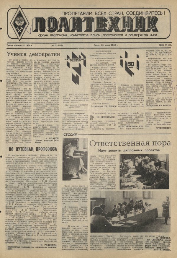 Политехник : газета/ Краснояр. политех. ин-т. - Красноярск : КГТУ, 1964 - - 2006 1988г. N 21 (853) (22 июня) http://lib3.sfu-kras.ru/ft/LIB2/ELIB_DC/SFUPRSV/sfupol/1988/1988_06_22_0853.pdf Держатели документа: Государственная универсальная научная библиотека Красноярского края