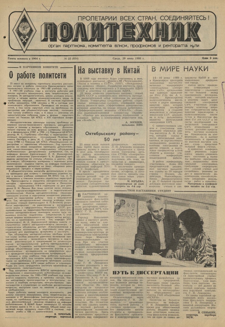Политехник : газета. 1988 г. № 22 (854) (29 июня)