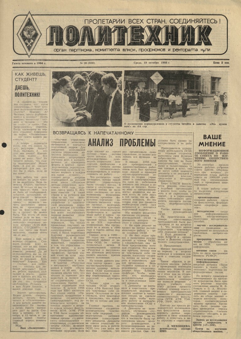 Политехник : газета. 1988 г. № 26 (858) (19 октября)