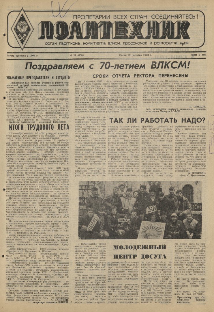 Политехник : газета. 1988 г. № 27 (859) (26 октября)