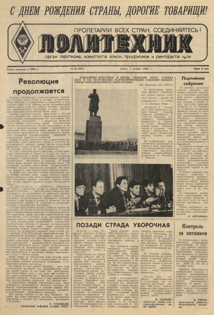 Политехник : газета/ Краснояр. политех. ин-т. - Красноярск : КГТУ, 1964 - - 2006 1988г. N 28 (860) (2 ноября) http://lib3.sfu-kras.ru/ft/LIB2/ELIB_DC/SFUPRSV/sfupol/1988/1988_11_02_0860.pdf