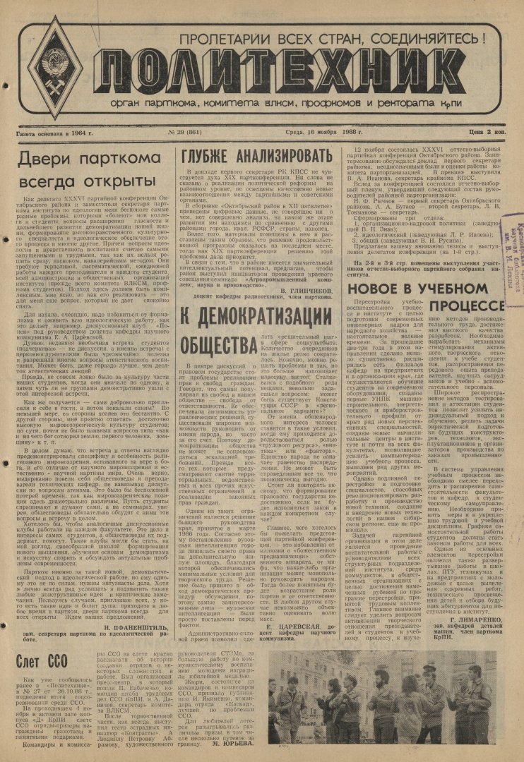 Политехник : газета. 1988 г. № 29 (861) (16 ноября)