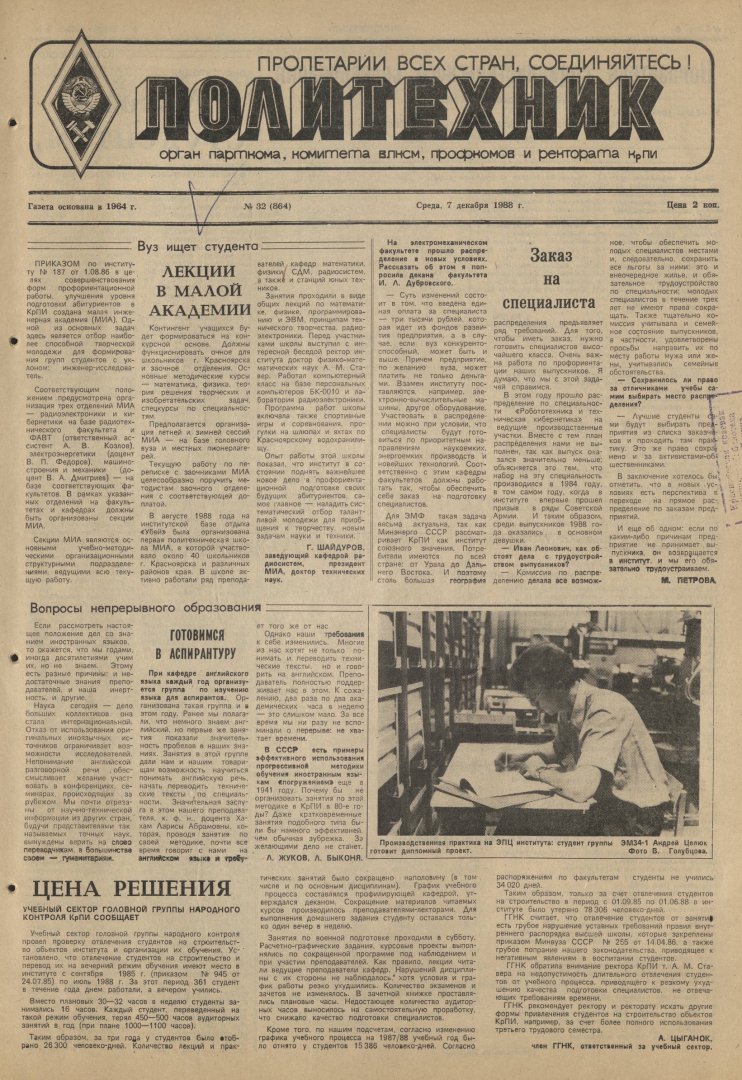 Политехник : газета. 1988 г. № 32 (864) (7 декабря)