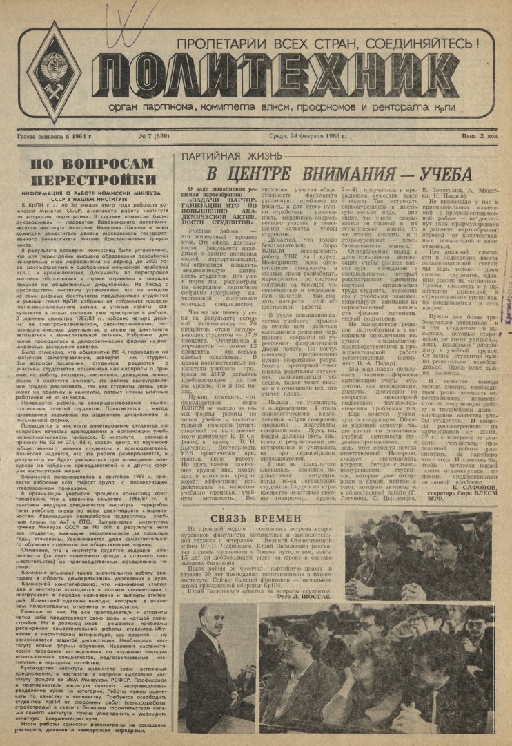 Политехник : газета. 1988 г. № 7 (839) (24 февраля)