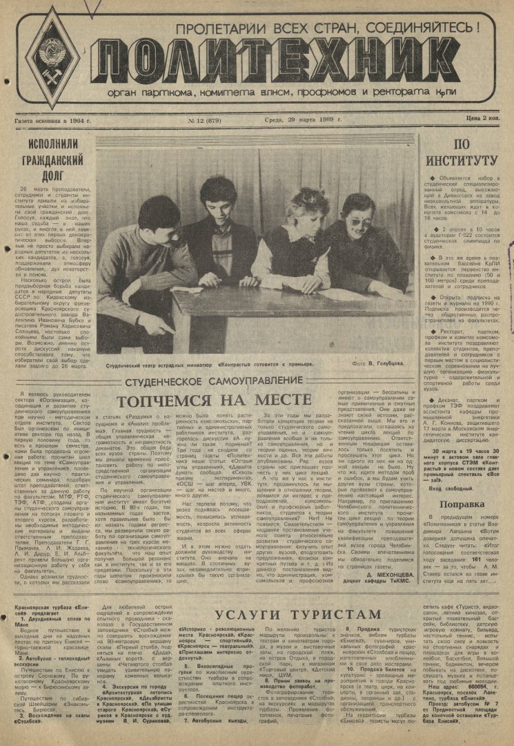 Политехник : газета. 1989 г. № 12 (879) (29 марта)