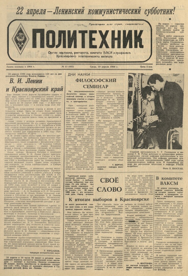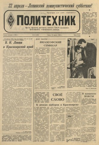Политехник : газета/ Краснояр. политех. ин-т. - Красноярск : КГТУ, 1964 - - 2006 1989г. N 15 (882) (19 апреля) http://lib3.sfu-kras.ru/ft/LIB2/ELIB_DC/SFUPRSV/sfupol/1989/1989_04_19_0882.pdf