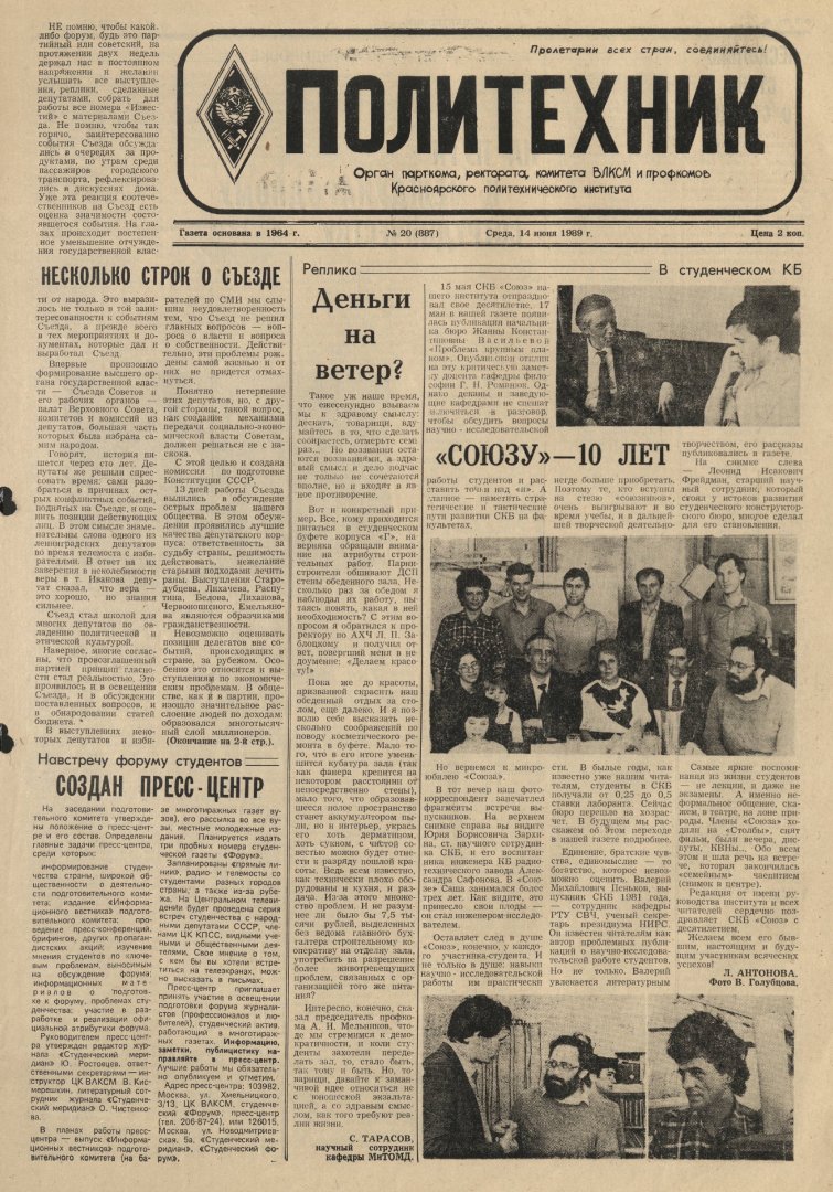 Политехник : газета/ Краснояр. политех. ин-т. - Красноярск : КГТУ, 1964 - - 2006 1989г. N 20 (887) (14 июня) http://lib3.sfu-kras.ru/ft/LIB2/ELIB_DC/SFUPRSV/sfupol/1989/1989_06_14_0887.pdf