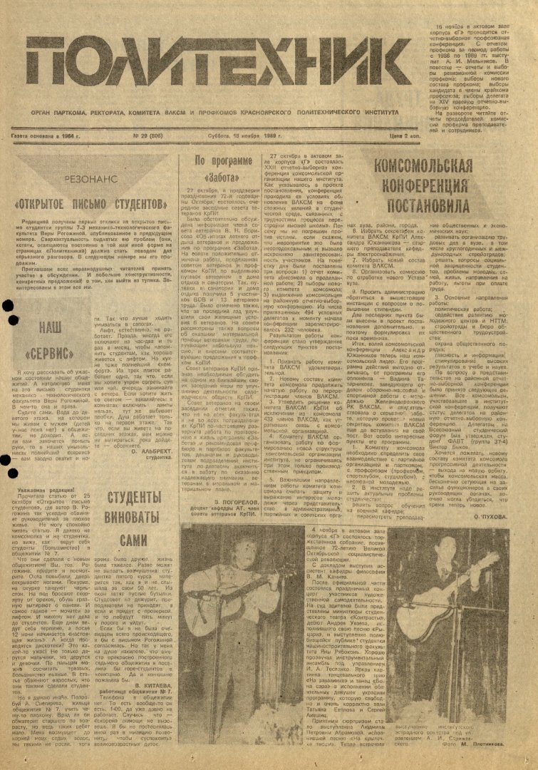Политехник : газета/ Краснояр. политех. ин-т. - Красноярск : КГТУ, 1964 - - 2006 1989г. N 29 (806) (15 ноября) http://lib3.sfu-kras.ru/ft/LIB2/ELIB_DC/SFUPRSV/sfupol/1989/1989_11_15_0806.pdf