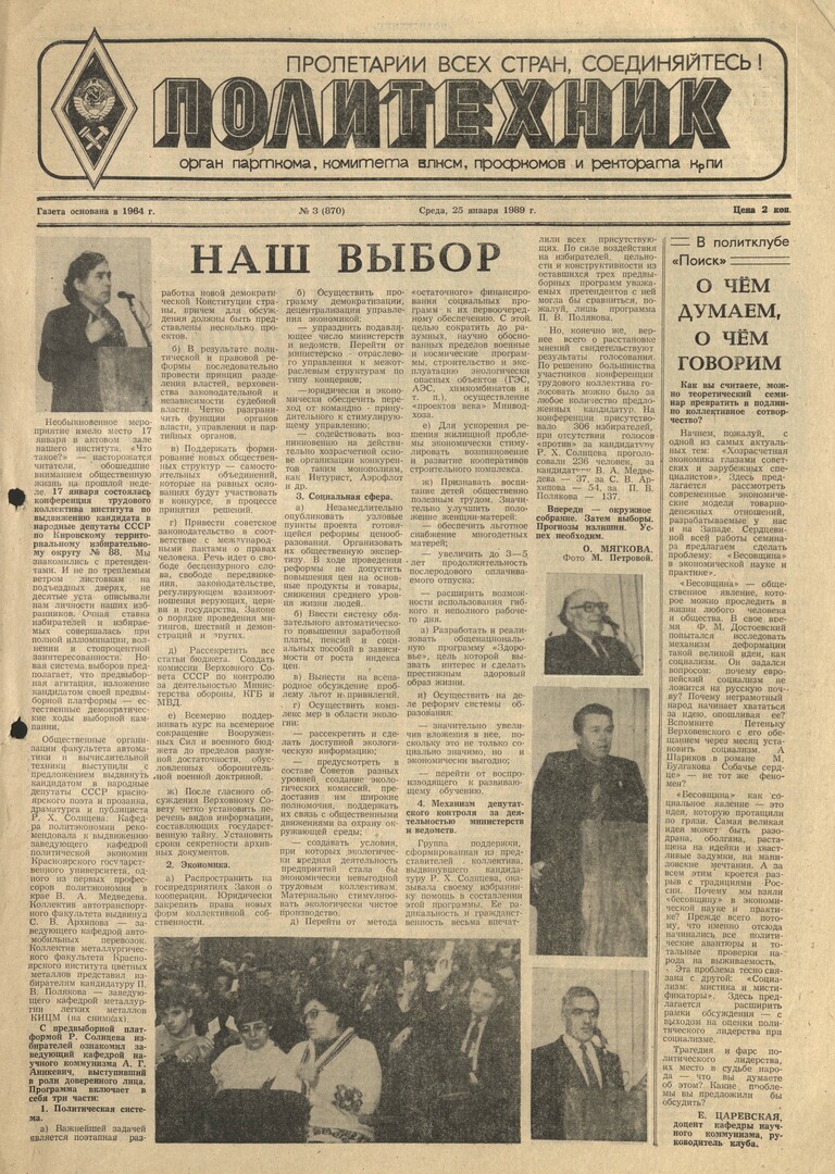 Политехник : газета/ Краснояр. политех. ин-т. - Красноярск : КГТУ, 1964 - - 2006 1989г. N 3 (870) (25 января) http://lib3.sfu-kras.ru/ft/LIB2/ELIB_DC/SFUPRSV/sfupol/1989/1989_01_25_0870.pdf