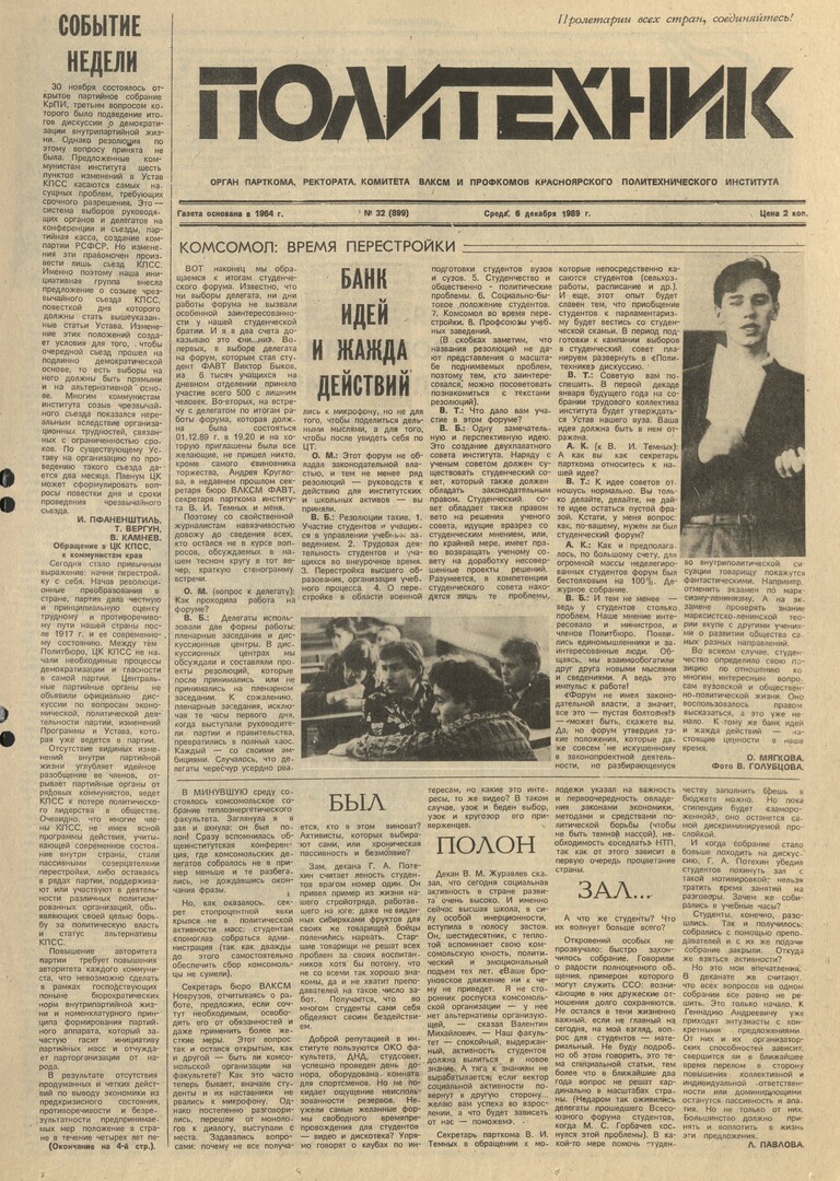 Политехник : газета/ Краснояр. политех. ин-т. - Красноярск : КГТУ, 1964 - - 2006 1989г. N 32 (899) (6 декабря) http://lib3.sfu-kras.ru/ft/LIB2/ELIB_DC/SFUPRSV/sfupol/1989/1989_12_06_0899.pdf