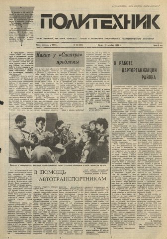 Политехник : газета/ Краснояр. политех. ин-т. - Красноярск : КГТУ, 1964 - - 2006 1989г. N 33 (900) (13 декабря) http://lib3.sfu-kras.ru/ft/LIB2/ELIB_DC/SFUPRSV/sfupol/1989/1989_12_13_0900.pdf