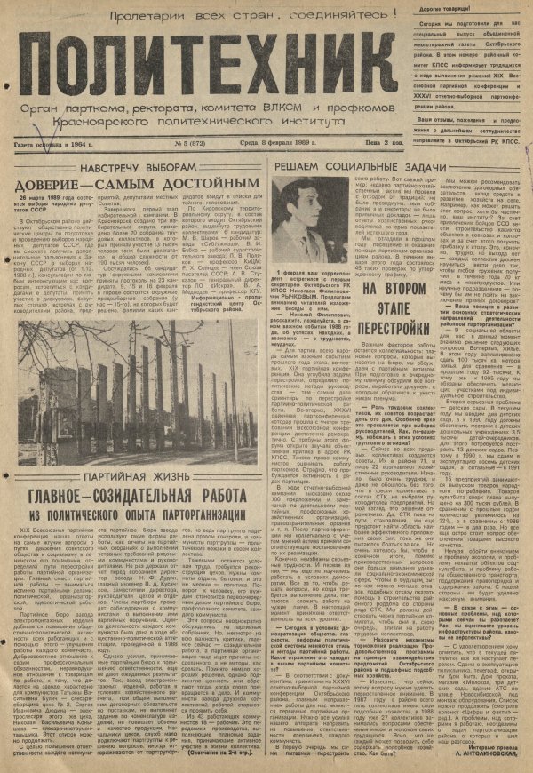 Политехник : газета. 1989 г. № 5 (872) (8 февраля)