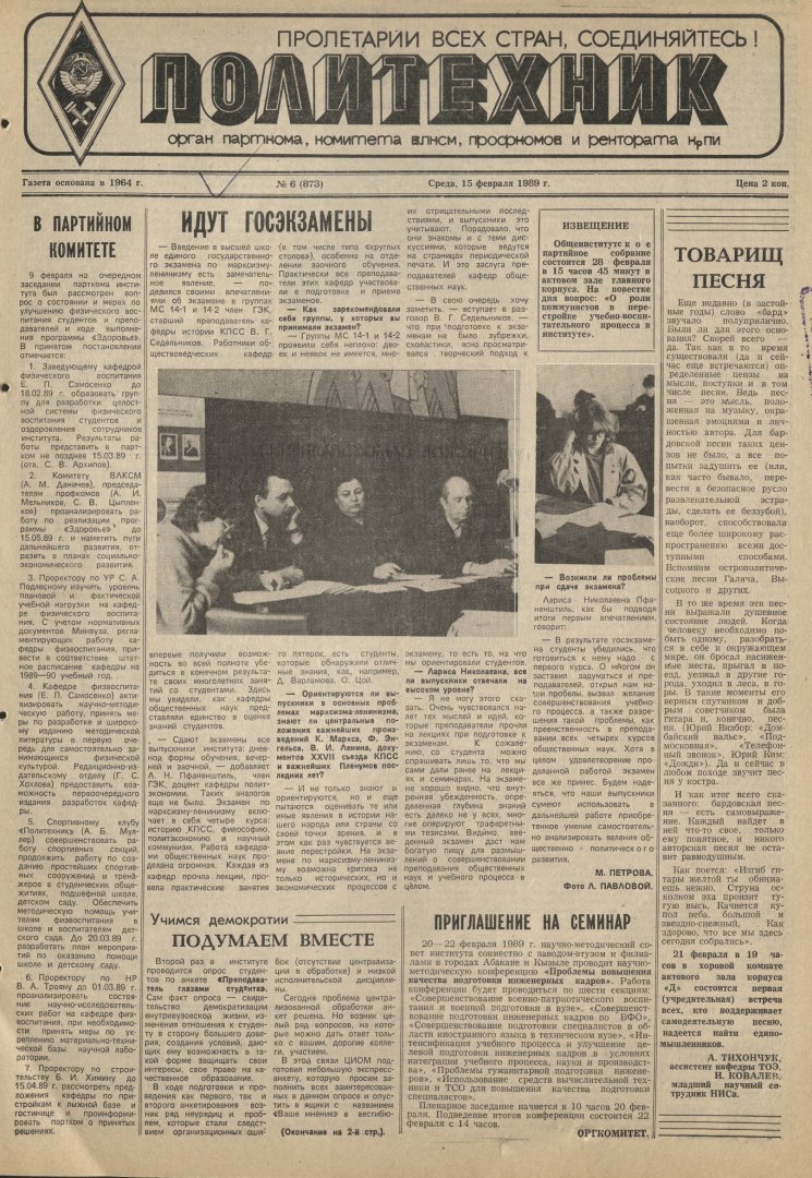 Политехник : газета. 1989 г. № 6 (873) (15 февраля)