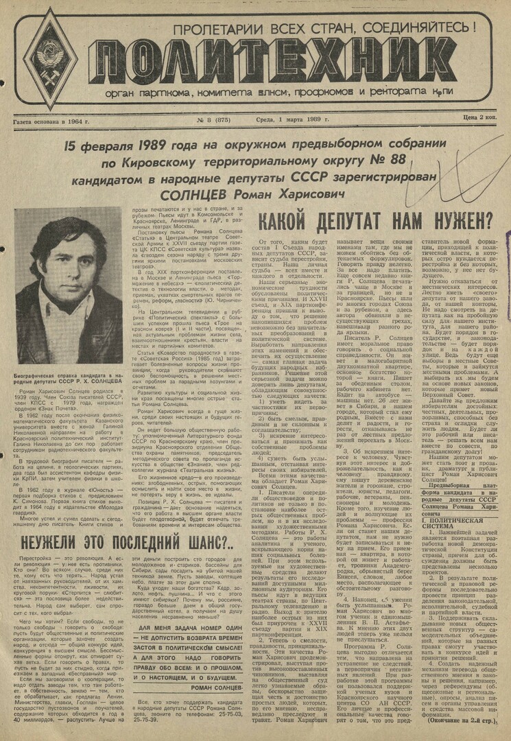 Политехник : газета. 1989 г. № 8 (875) (1 марта)