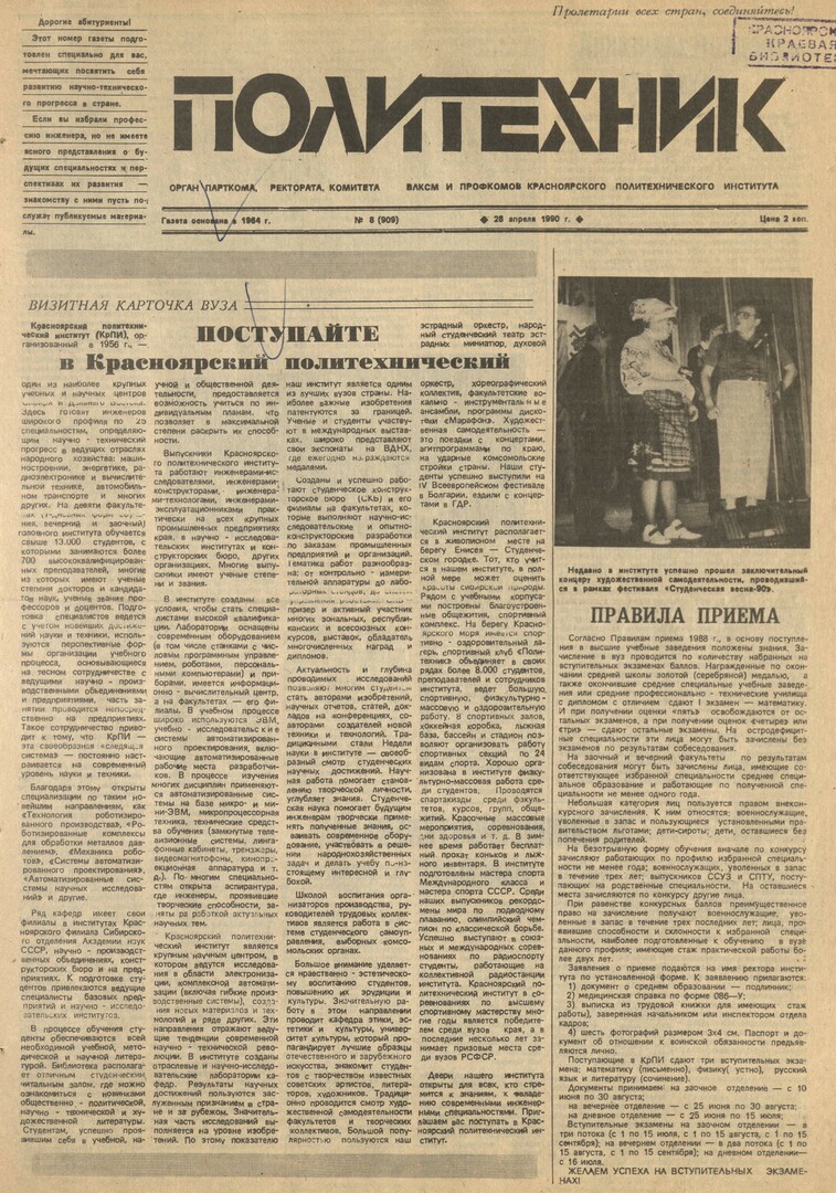 Политехник : газета. 1990 г. № 8 (909) (28 апреля)