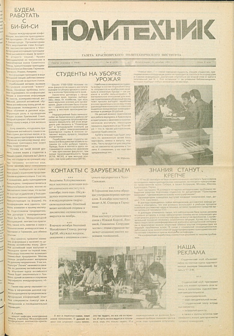 Библиографическое описание:Политехник : газета/ Краснояр. политех. ин-т. - Красноярск : КГТУ, 1964 - - 2006 1991г. N 8 (929) (21 октября - указано на 1-й стр., а на 3-й стр. в колонтитуле указано - 18 октября)