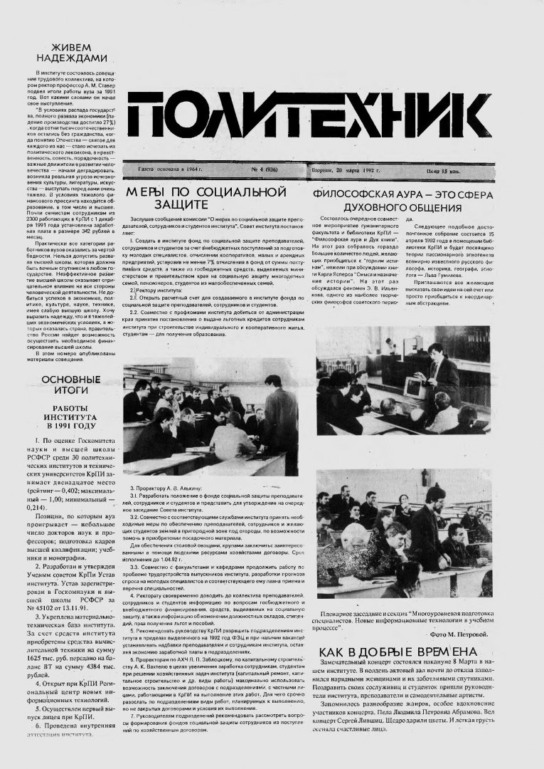 Политехник : газета. 1992 г. № 4 (936) (20 марта)