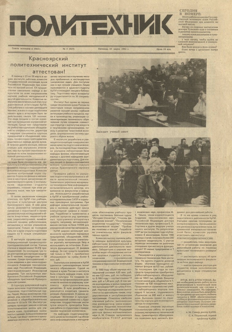Политехник : газета/ Краснояр. политех. ин-т. - Красноярск : КГТУ, 1964 - - 2006 1992г. N 5 (937) (10 апреля; на 1-й стр. опечатка - 10 марта, а на стр. 3 в колонтитуле указано - 11 апреля) http://lib3.sfu-kras.ru/ft/LIB2/ELIB_DC/SFUPRSV/sfupol/1992/1992_04_10_0937.pdf