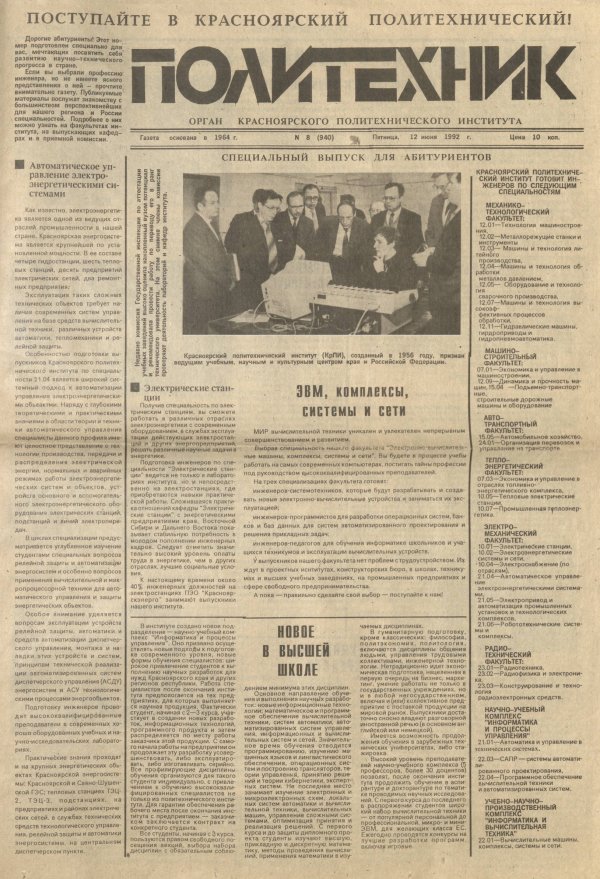 Политехник : газета/ Краснояр. политех. ин-т. - Красноярск : КГТУ, 1964 - - 2006 1992г. N 8 (940) (12 июня) http://lib3.sfu-kras.ru/ft/LIB2/ELIB_DC/SFUPRSV/sfupol/1992/1992_06_12_0940.pdf