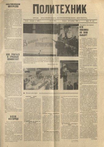 Политехник : газета/ Краснояр. политех. ин-т. - Красноярск : КГТУ, 1964 - - 2006 1992г. N 9 (941) (22 сентября) http://lib3.sfu-kras.ru/ft/LIB2/ELIB_DC/SFUPRSV/sfupol/1992/1992_09_22_0941.pdf