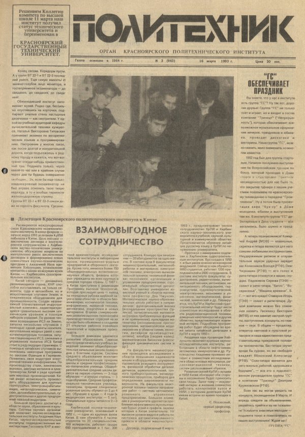 Политехник : газета/ Краснояр. политех. ин-т. - Красноярск : КГТУ, 1964 - - 2006 1993г. N 3 (943) (16 марта) http://lib3.sfu-kras.ru/ft/LIB2/ELIB_DC/SFUPRSV/sfupol/1993/1993_03_16_0943.pdf