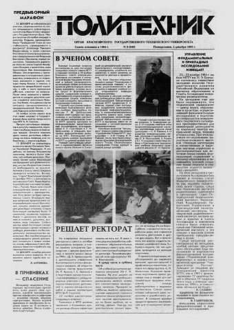 Политехник : газета/ Краснояр. политех. ин-т. - Красноярск : КГТУ, 1964 - - 2006 1993г. N 9 (949) (2 декабря) http://lib3.sfu-kras.ru/ft/LIB2/ELIB_DC/SFUPRSV/sfupol/1993/1993_12_02_0949.pdf