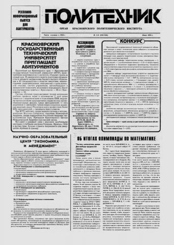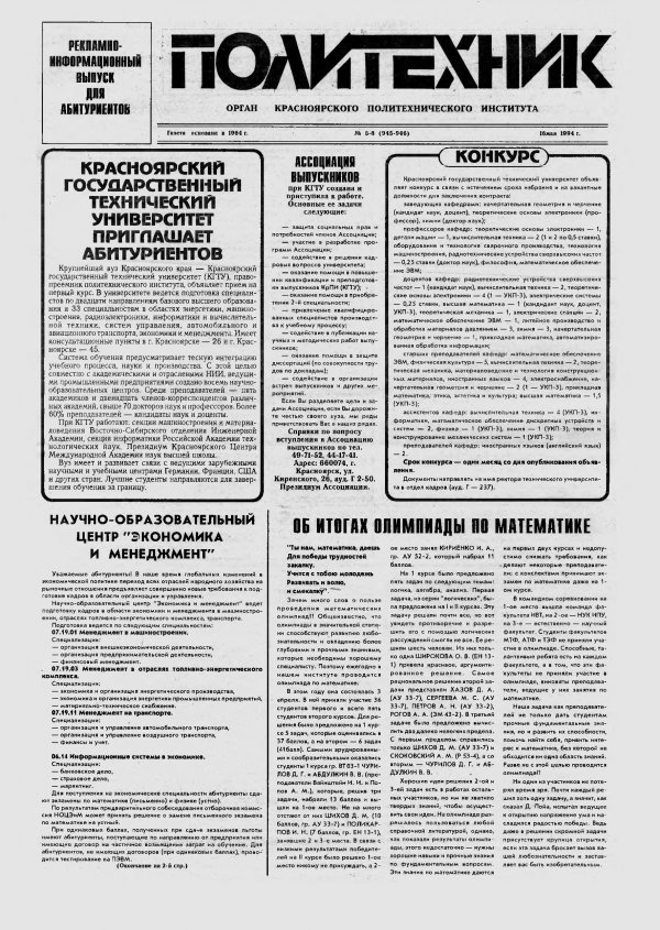 Политехник : газета/ Краснояр. политех. ин-т. - Красноярск : КГТУ, 1964 - - 2006 1994г. N 5/6 (945-946) (16 мая) http://lib3.sfu-kras.ru/ft/LIB2/ELIB_DC/SFUPRSV/sfupol/1994/1994_05_16_0945-0946.pdf