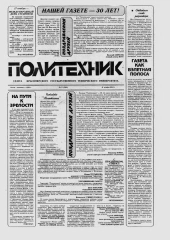 Политехник : газета/ Краснояр. политех. ин-т. - Красноярск : КГТУ, 1964 - - 2006 1994г. N 8 (948) (11 ноября) http://lib3.sfu-kras.ru/ft/LIB2/ELIB_DC/SFUPRSV/sfupol/1994/1994_11_11_0948.pdf