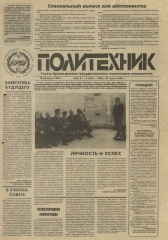 Политехник : газета/ Краснояр. политех. ин-т. - Красноярск : КГТУ, 1964 - - 2006 1995г. N 5/6 (967-968) (20 июня) http://lib3.sfu-kras.ru/ft/LIB2/ELIB_DC/SFUPRSV/sfupol/1995/1995_06_20_0967-0968.pdf