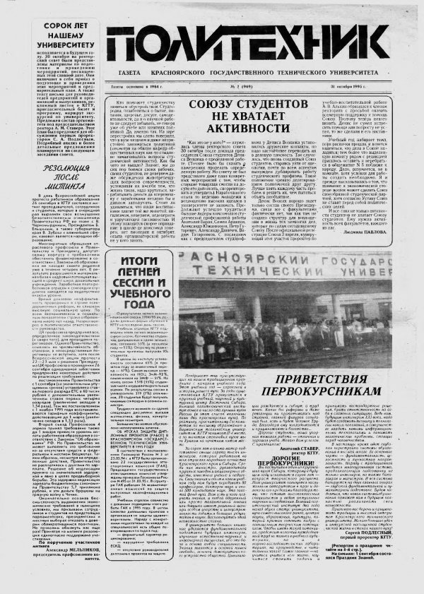 Политехник : газета/ Краснояр. политех. ин-т. - Красноярск : КГТУ, 1964 - - 2006 1995г. N 7 (969) (31 октября) http://lib3.sfu-kras.ru/ft/LIB2/ELIB_DC/SFUPRSV/sfupol/1995/1995_10_31_0969.pdf