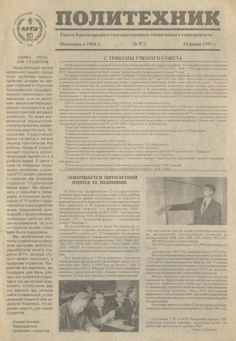Политехник : газета/ Краснояр. политех. ин-т. - Красноярск : КГТУ, 1964 - - 2006 1997г. N 973 (24 июня) http://lib3.sfu-kras.ru/ft/LIB2/ELIB_DC/SFUPRSV/sfupol/1997/1997_06_24_0973.pdf