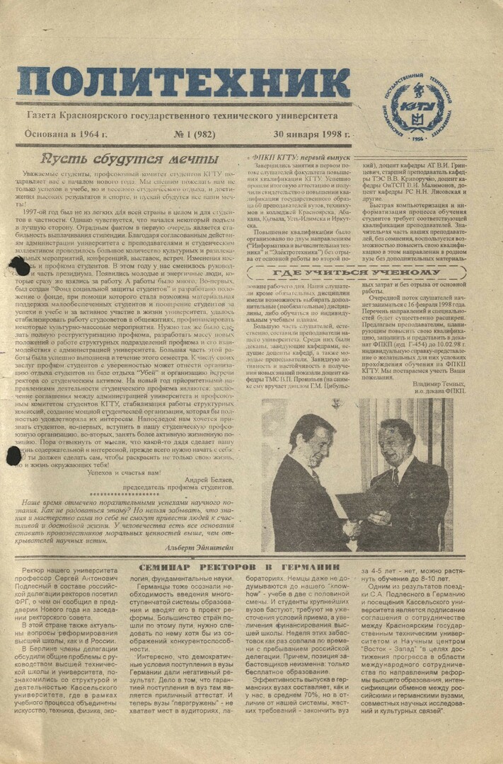 Политехник : газета/ Краснояр. политех. ин-т. - Красноярск : КГТУ, 1964 - - 2006 1998г. N 1 (982) (30 января) http://lib3.sfu-kras.ru/ft/LIB2/ELIB_DC/SFUPRSV/sfupol/1998/1998_01_30_0982.pdf