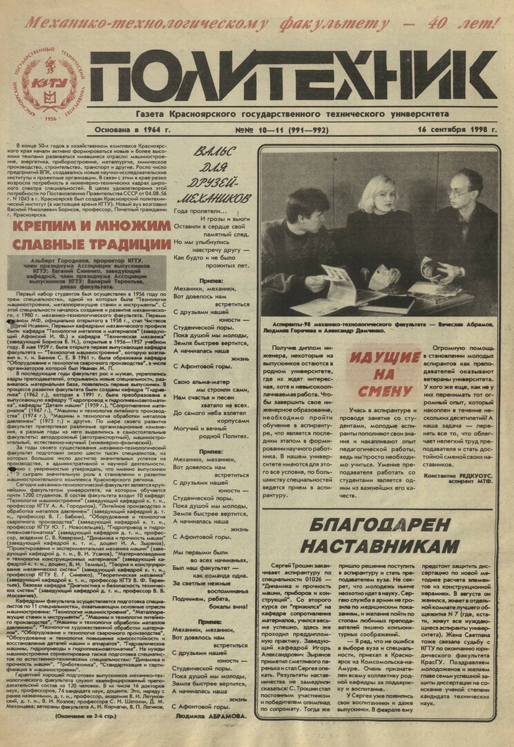 Политехник : газета/ Краснояр. политех. ин-т. - Красноярск : КГТУ, 1964 - - 2006 1998г. N 10/11 (991-992) (16 сентября) http://lib3.sfu-kras.ru/ft/LIB2/ELIB_DC/SFUPRSV/sfupol/1998/1998_09_16_0991-0992.pdf