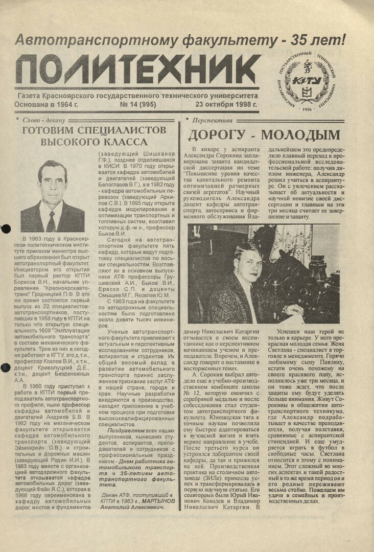 Политехник : газета/ Краснояр. политех. ин-т. - Красноярск : КГТУ, 1964 - - 2006 1998г. N 14 (995) (23 октября) http://lib3.sfu-kras.ru/ft/LIB2/ELIB_DC/SFUPRSV/sfupol/1998/1998_10_23_0995.pdf
