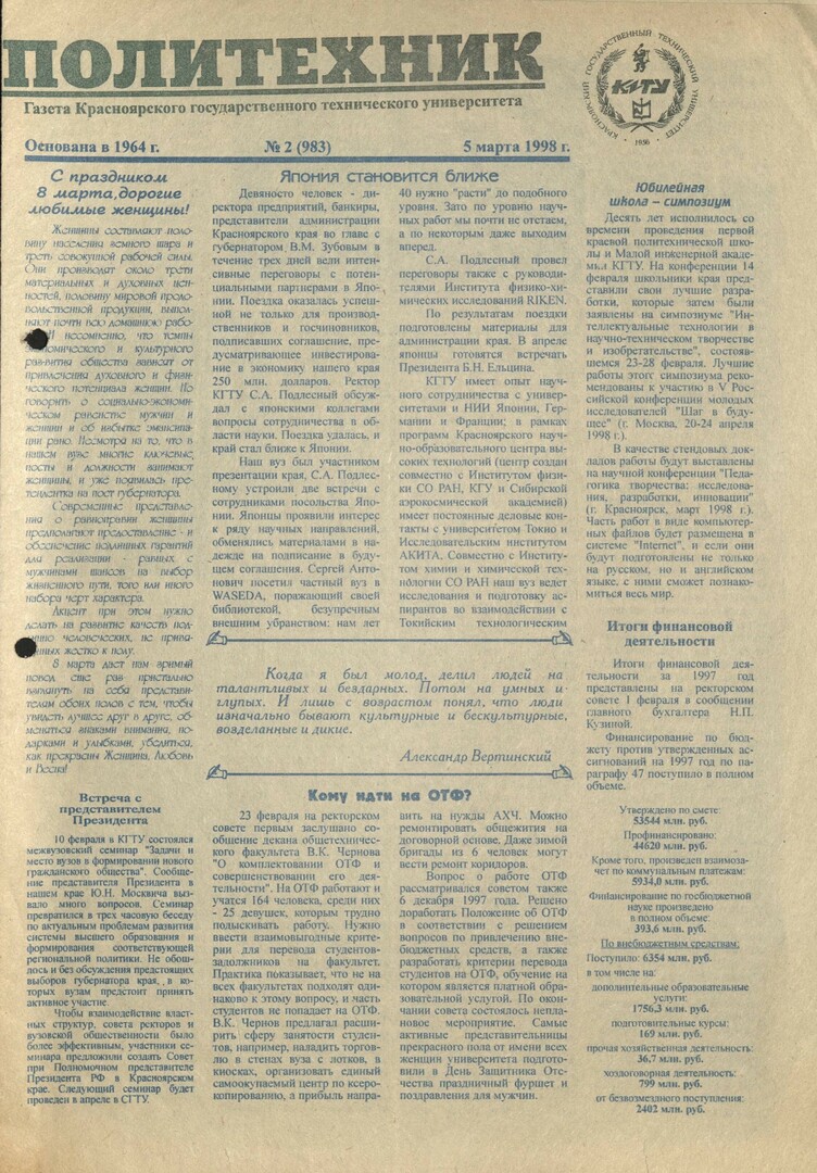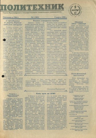 Политехник : газета/ Краснояр. политех. ин-т. - Красноярск : КГТУ, 1964 - - 2006 1998г. N 2 (983) (5 марта) http://lib3.sfu-kras.ru/ft/LIB2/ELIB_DC/SFUPRSV/sfupol/1998/1998_03_05_0983.pdf