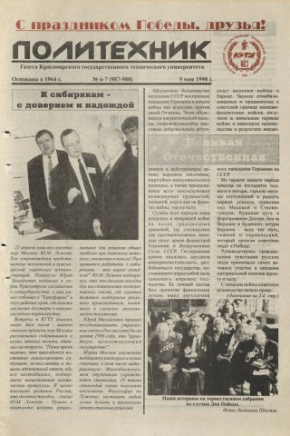 Политехник : газета/ Краснояр. политех. ин-т. - Красноярск : КГТУ, 1964 - - 2006 1998г. N 6/7 (987-988) (5 мая) http://lib3.sfu-kras.ru/ft/LIB2/ELIB_DC/SFUPRSV/sfupol/1998/1998_05_05_0987-0988.pdf