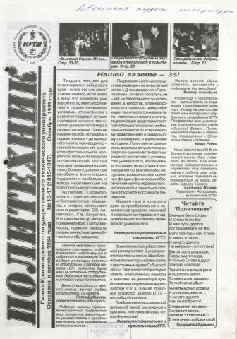 Политехник : газета/ Краснояр. политех. ин-т. - Красноярск : КГТУ, 1964 - - 2006 1999г. N 15/16/17 (1015-1017) (октябрь) http://lib3.sfu-kras.ru/ft/LIB2/ELIB_DC/SFUPRSV/sfupol/1999/1999_10_ _1015-1017.pdf