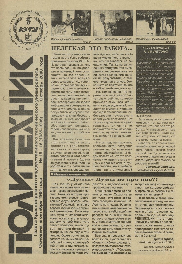 Библиографическое описание:Политехник : газета/ Краснояр. политех. ин-т. - Красноярск : КГТУ, 1964 - - 2006 2000г. N 15/16 (1035-1036) (октябрь)