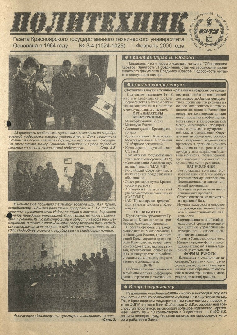 Политехник : газета/ Краснояр. политех. ин-т. - Красноярск : КГТУ, 1964 - - 2006 2000г. N 3/4 (1024-1025) (февраль) http://lib3.sfu-kras.ru/ft/LIB2/ELIB_DC/SFUPRSV/sfupol/2000/2000_02_ _1024-1025.pdf