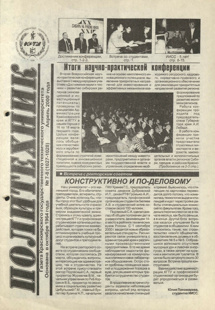 Политехник : газета/ Краснояр. политех. ин-т. - Красноярск : КГТУ, 1964 - - 2006 2000г. N 7/8 (1027-1028) (апрель) http://lib3.sfu-kras.ru/ft/LIB2/ELIB_DC/SFUPRSV/sfupol/2000/2000_04_ _1027-1028.pdf